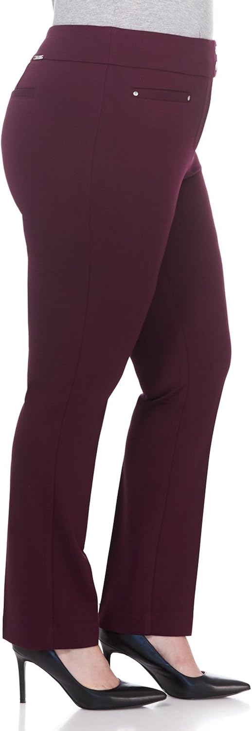 66% Rayon, 29% Nylon, 5% Spandex Pull On closure Machine Wash SECRET FIGURE YOGA DRESS PANT: Fits and flatters your body in all the right places! Feels like a yoga pant but looks like a dress pant; polished and professional. TUMMY CONTROL: Pull-On styling and hidden front tummy control panel. Smooth contour waistband with accent snaps at the waist add a touch of bling. Functional front pockets, faux back pockets. DETAILS: Inseam Regular = 31"/Petite= 28". Leg opening = 18" (based on sz 14W). Mid-rise, straight leg style is fitted from waist to knee, with a straight leg opening from the knee down. LUXURIOUS FABRIC: Our compression knit ponte contours and sculpts your curves. Fabric is gutsy, perfect to hide any imperfections! Rayon/Nylon/Spandex blend. Made in Cambodia or China. Please consult our size chart before ordering to ensure you get the best fit for your body! Model is 5'10 wearing size pant 14W.