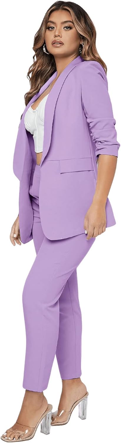 100% Polyester Zipper closure Material: Polyester Solid color, 3/4 sleeve, shawl collar, open front, pockets, ruched sleeve blazer Plain color, zipper closure, regular fit, regular length, elegant pants Great for work, office, meeting, business, evening party and other formal occasions Please refer to the size measurement in image before ordering