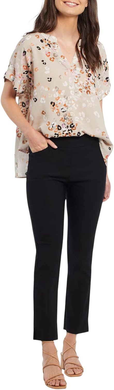 76% Rayon, 21% Nylon, 3% Spandex Imported Button closure MACHINE WASH DELICATE CYCLE COLD WATER, WITH SIMILAR COLORS, DO NOT BLEACH, LINE DRY, LOW IRON IF NEEDED Tummy slimming Pull-on flat waistband Slim (7 1/4" flat-laid) leg with side-slit hem 28" inseam