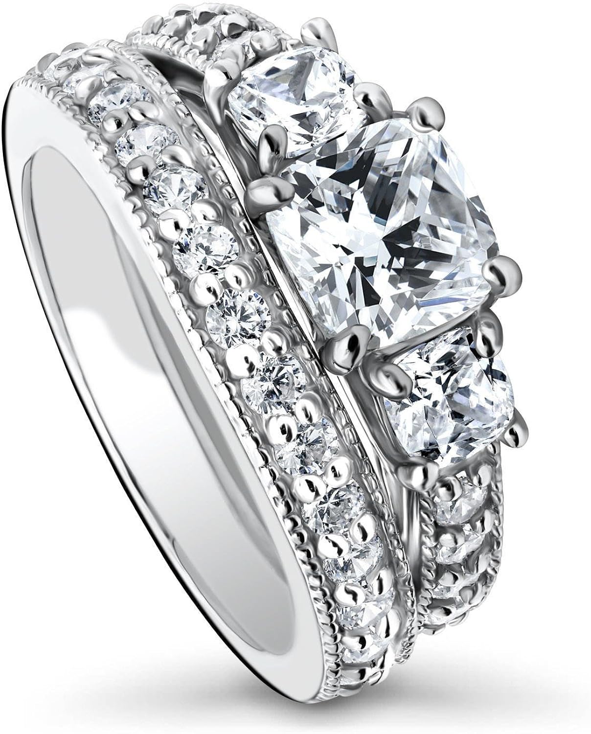 【METAL】 This 3-stone wedding engagement 2 piece ring set is crafted with fine 925 sterling silver, plated with rhodium to enhance shine and durability. Nickel free for sensitive skin and won't turn your skin green if properly cared for. SIZING TIPS: This ring's band width is wide, so we suggest you choose a ring size 1/2 or 1 size larger than your standard ring size to make sure the ring will fit comfortably. 【STONE】 Main stone features 1.5 carat cushion cut cubic zirconia (6.5mm) in prong setting. Accented with 1.29 ct.tw cushion cut and round CZ (4mm - 2mm) in prong and pave setting. Layer on this stackable ring for the ultimate effortless style. 【MEASUREMENTS】 Band measures 6mm in width. This 2-piece 3-stone ring set inspires awe with its simple elegance and breathtaking finish. 【FREE RETURN & WARRANTY】 Free return within U.S. Warrants against defects in materials and workmanship for 90 days; excludes general wear & tear and misuse. ? This ring is beautifully packaged in a free gift box, making it a perfect bridal wedding engagement rings for her or a romantic jewelry gift for Valentine's Day and anniversary.