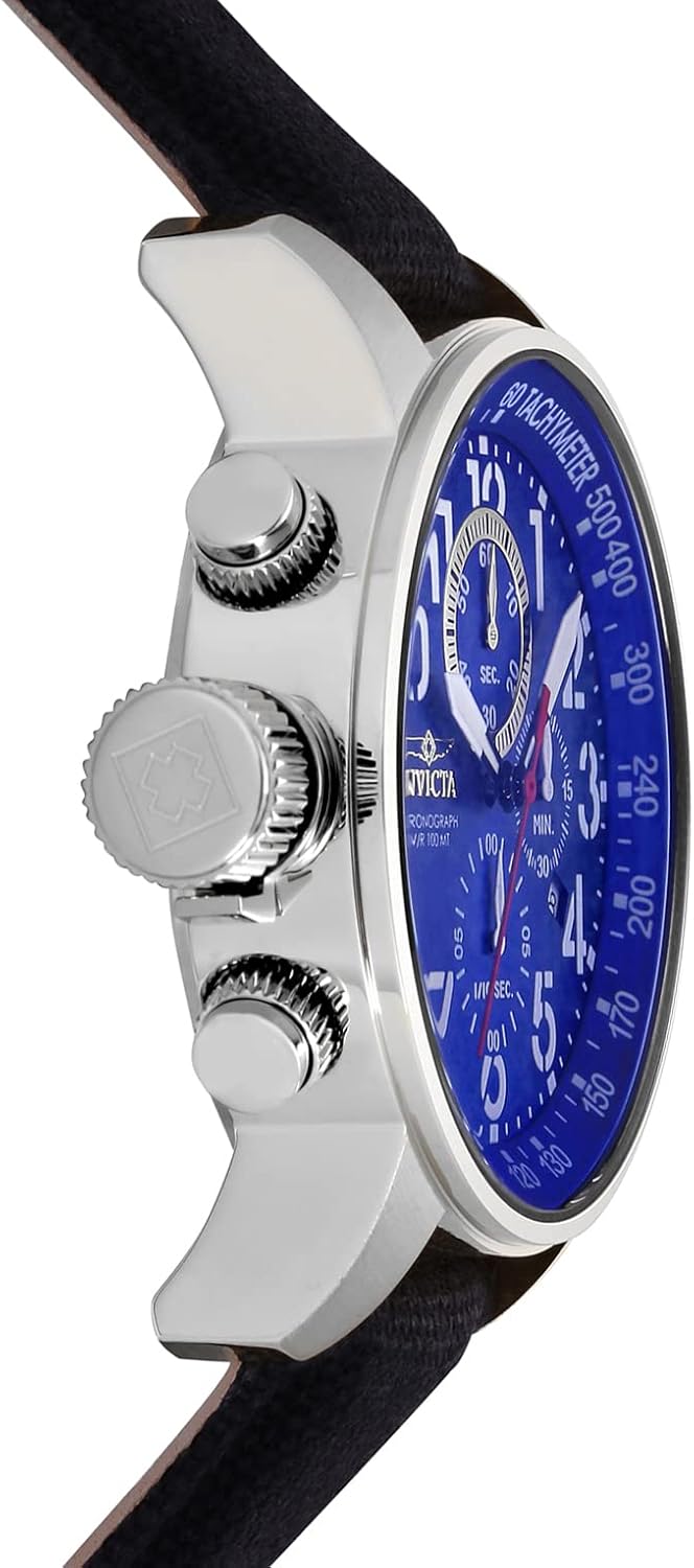 Imported Mix high style and high function with this Invicta watch, featuring a masculine blue dial with stencil-like numerals, a polished stainless steel case, and a sturdy black cloth strap with leather backing. Chronograph functions with 60-second, 60-minute, and 0.1-second subdials Blue dial with date window and luminous hands Tachymeter scale on inner bezel Water resistant to 330 feet (100 M): suitable for snorkeling, as well as swimming, but not diving