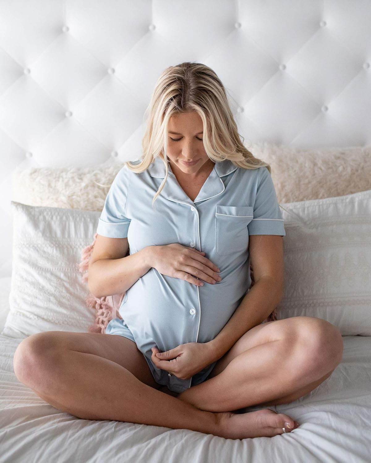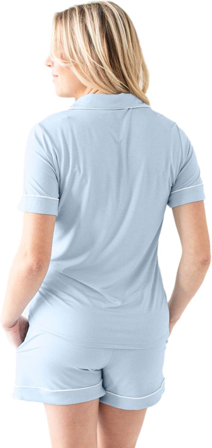 95% Viscose, 5% Spandex Imported Button closure Machine Wash MADE OF PREMIUM BAMBOO - Designed to wear before, during, and after your pregnancy, this comfortable maternity and nursing pajama set is made of super-soft bamboo fabric. The sleek fabric is gentle on mom and baby’s sensitive skin and adds a touch of elegance to your maternity and postpartum wardrobe. COMFORTABLE AND STYLISH - This classic button down pajama set features a timeless design updated with fashionable details including delicate piping, notched collar, and pockets. IDEAL FOR POSTPARTUM AND NURSING - The short-sleeve top has easy, button-down nursing access and opens fully for skin to skin contact. The pajama shorts have a soft, wide elastic waistband to accommodate size fluctuations common in pregnancy and postpartum.