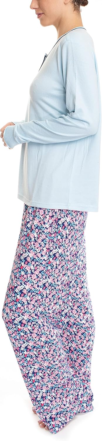 This pajama set includes a 3/4 sleeve top and a comfy sleep pant available in Small, Medium, Large, X-Large, 1X, 2X, and 3X. Machine wash with like colors and tumble dry low Show more