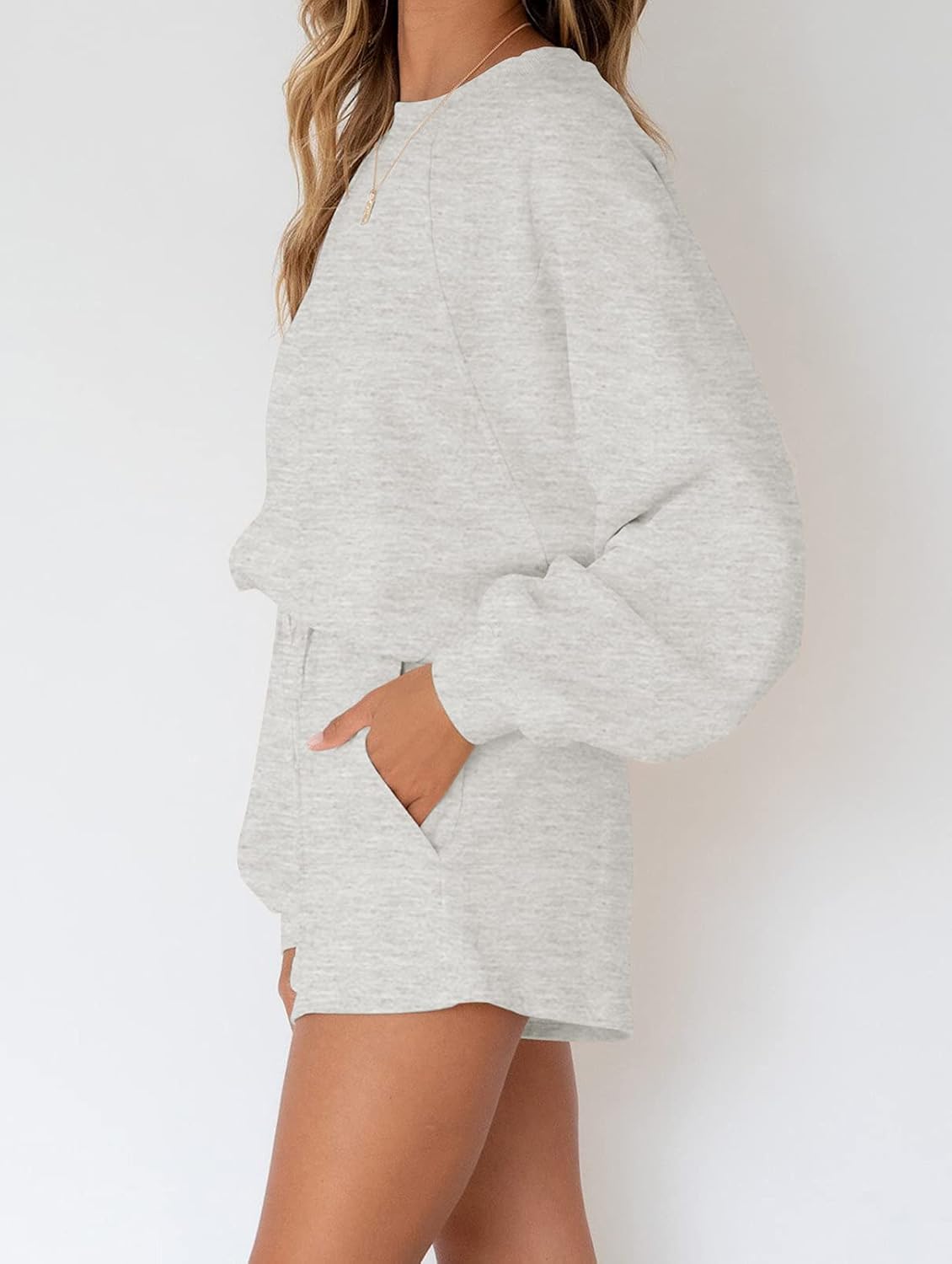 85%Rayon 15%Polyester Imported Pull On closure Machine Wash Size Guide: S=US 4-6, M=US 8-10, L=US 12-14, XL=16. Made of soft and comfortable fabric, warm enough, very gentle on the skin. Lounging all around house freely! Main Features: Thick and cozy materials adopt. This lounge sets includes a long sleeve batwing sweatshirt top and a high waist matching shorts, round neck, drop shoulder, patchwork design, loose fit shorts, wide leg, stays cool and fresh. Effortless beauty, how dreamy is the new sweatshirt set. Oversized bat sleeve tops gives you more space in the shoulders and arm parts, no limits to make any movement even in winter. Ribbed cuffs and hem to lock warm and softness. You will love the solid color pullover design, super cute and stylish. Matching high waist shorts has elastic waistband and drawstring to match all figures adjustment.