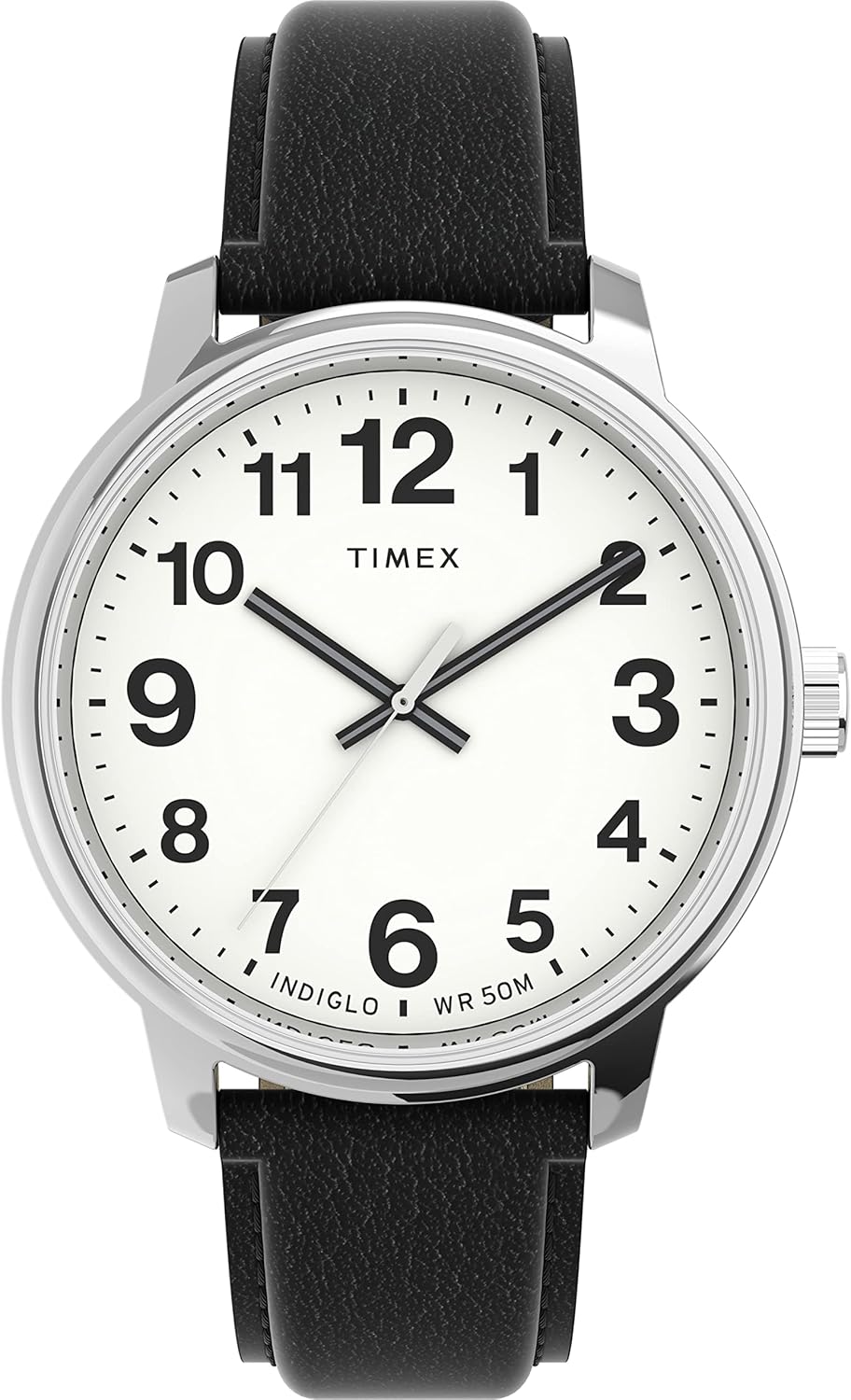 Adjustable black 20mm genuine leather strap fits up to 8-inch wrist circumference White easy-to-read dial with bold black full Arabic numerals & black hands Silver-tone 43mm brass case with mineral glass crystal Indiglo light-up watch dial Water resistant to 50m (165 ft): In general, suitable for short periods of recreational swimming, but not diving or snorkeling