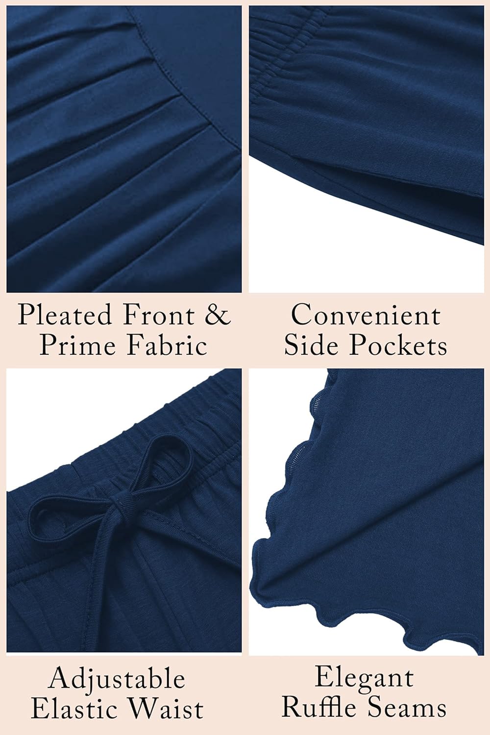 PRIME FABRIC - 95% Rayon, 5% Spandex. Soft, stretchy, lightweight and breathable 进口 Pull On closure Hand Wash Only DESIGNED FOR COMFORT - Cozy Women's Pajama set made with prime fabric, pleated front and ruffle trim deliver a soft touch, feminine style and LONG-LASTING wear. O neck, short sleeve, capri length sleep pants, pockets, elastic waist, casual relaxed loose fit style. SOFT YET DURABLE - Our classic Women's PJs keep you RESTED AND RELAXED in soft fabric that maintains its original colors; Soft Ladies Sleepwear includes EASY-FITTING CAPRIS and a SHORT-SLEEVE TOP so you stay comfy without overheating FITS JUST RIGHT - Capris Womens Pajama pants offer adjustable comfort with an ELASTIC WAIST and drawstring so you can loosen or tighten them to your liking, and the fit is always true to size