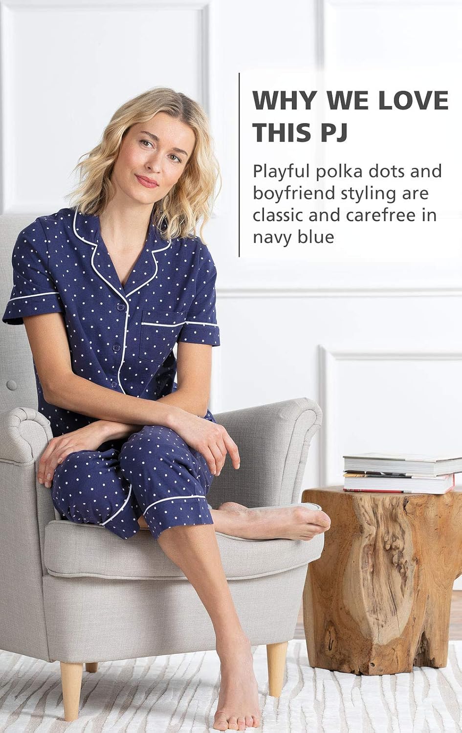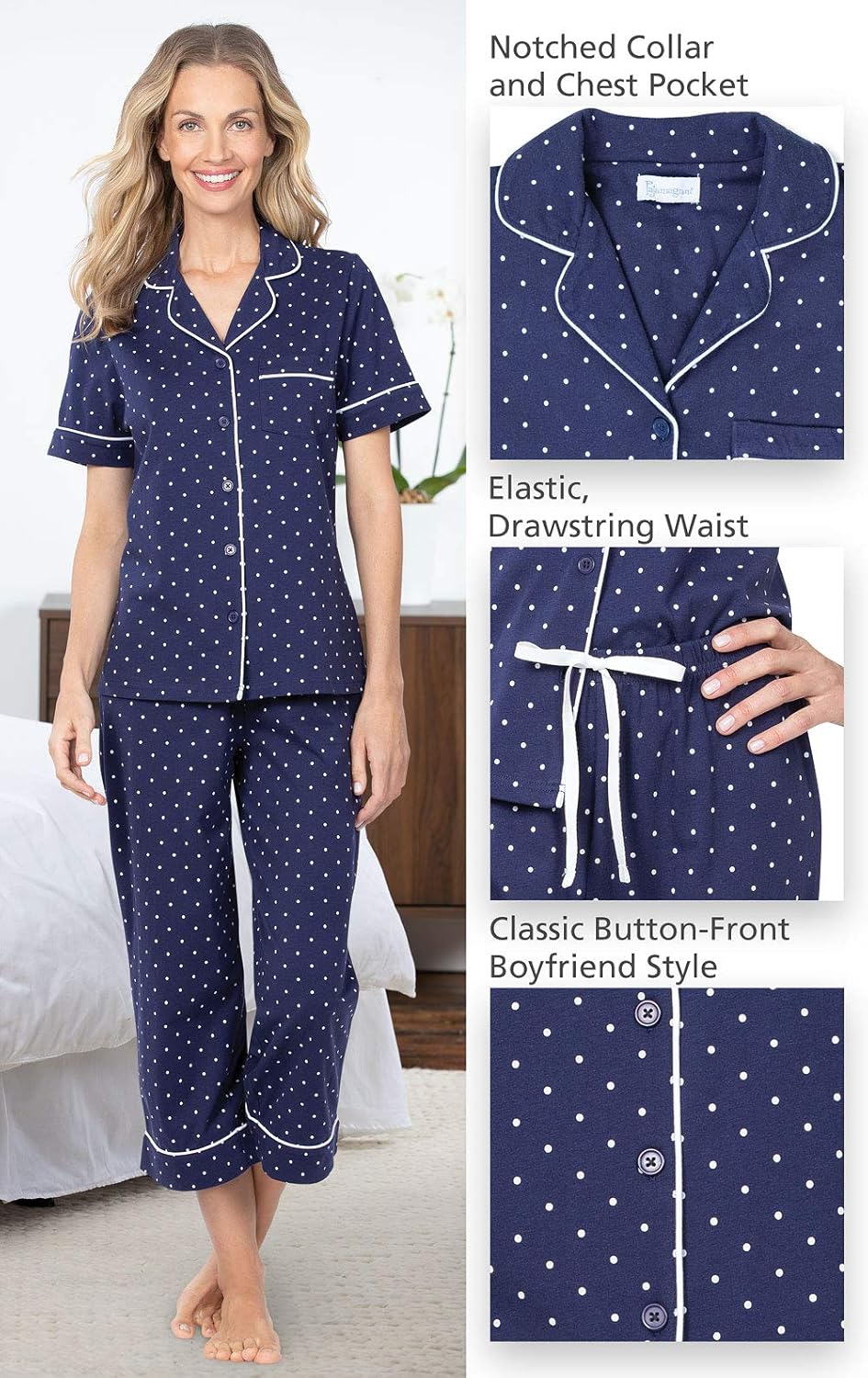 100% Cotton Drawstring closure Machine Wash Roomy Fit - Our Pjs are designed to be relaxed & generously oversized. You may find they run large. If you are between sizes, we recommend sizing down. See size chart below to help you find your perfect fit. Softest Quality Cotton - Two-piece women's pajama set is made of the softest double-brushed cotton jersey; Fabric stays soft wash after wash, making them your favorite pjs Great Fit & Function - Short-sleeve women's pjs include a button front top with a convenient chest pocket; Comfy capris have an elastic drawstring waist for a comfortable, custom fit The Highest Quality - Your favorite two-piece pajama set should feel as soft a year from now as they do on day 1; These classic cotton jersey pajamas are designed for ultimate comfort and durability Boyfriend Style - Button-front Womens PJs are inspired by favorite menswear styles; Classic short sleeve top is with notched collar and chest pocket; Capri-length pants with an elastic drawstring waist