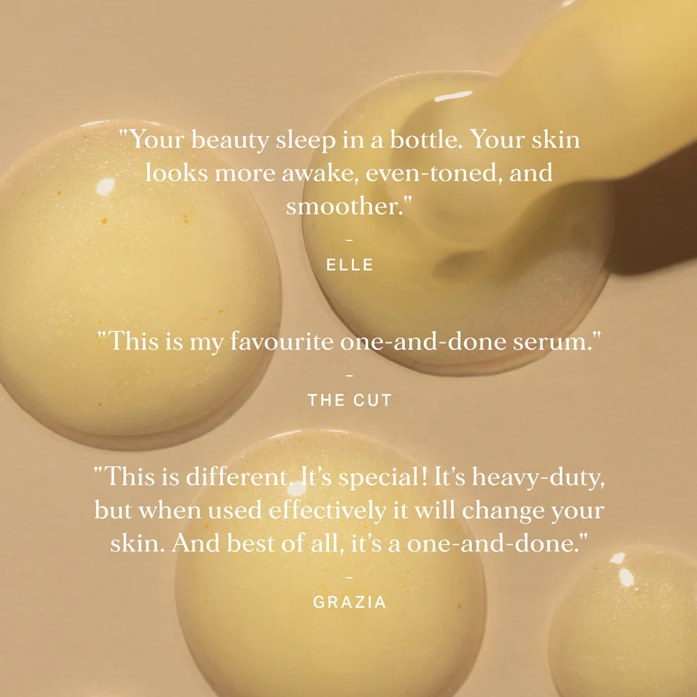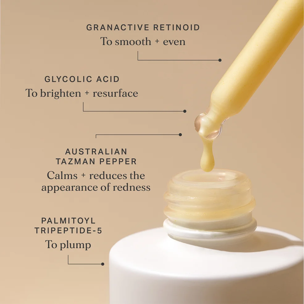 Delivering unrivalled resurfacing and cell-renewing properties, this potent elixir is powered by 14% glycolic acid in tandem with 1% granactive retinoid to target pigmentation, dullness, uneven texture, congestion, diminished elasticity and the appearance of fine lines and wrinkles – all in one simple, effective, non-irritating step. Skin-compatible and supercharged, this is further enriched with Coenzyme Q10 to help fade away dark spots and post-blemish scarring, while anti-inflammatory Australian Tazman pepper works alongside antioxidant ferulic acid and collagen-stimulating tripeptide-5, to accelerate turnover, ward against harmful aggressors and help to restore your skin’s strength and resilience. In clinical trials, 83% of users noticed an improvement in their skin’s tone and luminosity, while 63% reported that their skin felt firmer and more ‘elastic’.