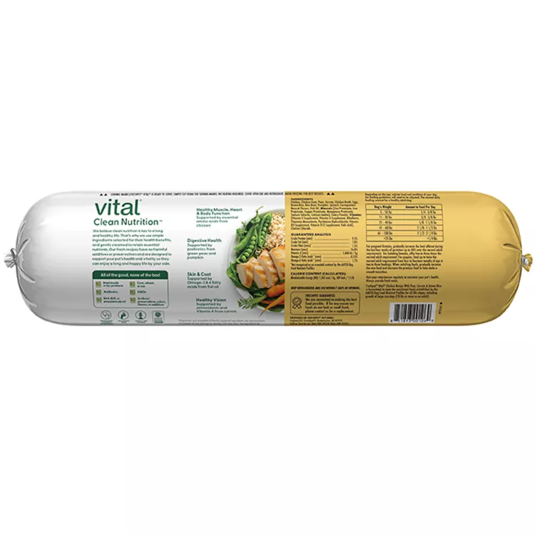 Freshpet Vital Balanced Nutrition Chicken and Whole Grain Fresh Dog Food is gently cooked with natural chicken, vitamin-rich peas and carrots, high-fiber brown rice and Omega-3 and 6 fatty acids. This recipe gives your dog the optimal nutrition they need for healthy digestion and a shiny coat. Verified Non-GMO.