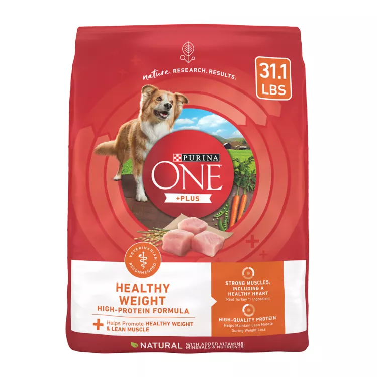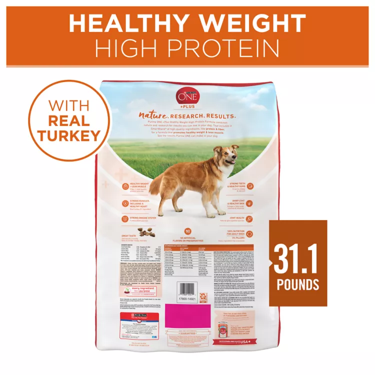 Help your dog maintain an ideal weight with Purina ONE Plus Healthy Weight High-Protein Formula dry adult dog food. This weight control dog food delivers a SmartBlend of high-quality ingredients in a flavorful protein-rich recipe made with real turkey as the number 1 ingredient to support strong, lean muscles, including a healthy heart. Even better, four antioxidant sources in this high protein dog food provide immune support for dogs, and natural glucosamine sources support dog joint health. Plus, with a combo of tender, meaty morsels and crunchy dog kibble, dogs love the taste and texture too. This dog weight management formula is made with no artificial flavors or preservatives and 0 percent fillers, so every high-quality ingredient has a purpose. Give your best friend purposeful nutrition that combines nature and research for results you can see.
